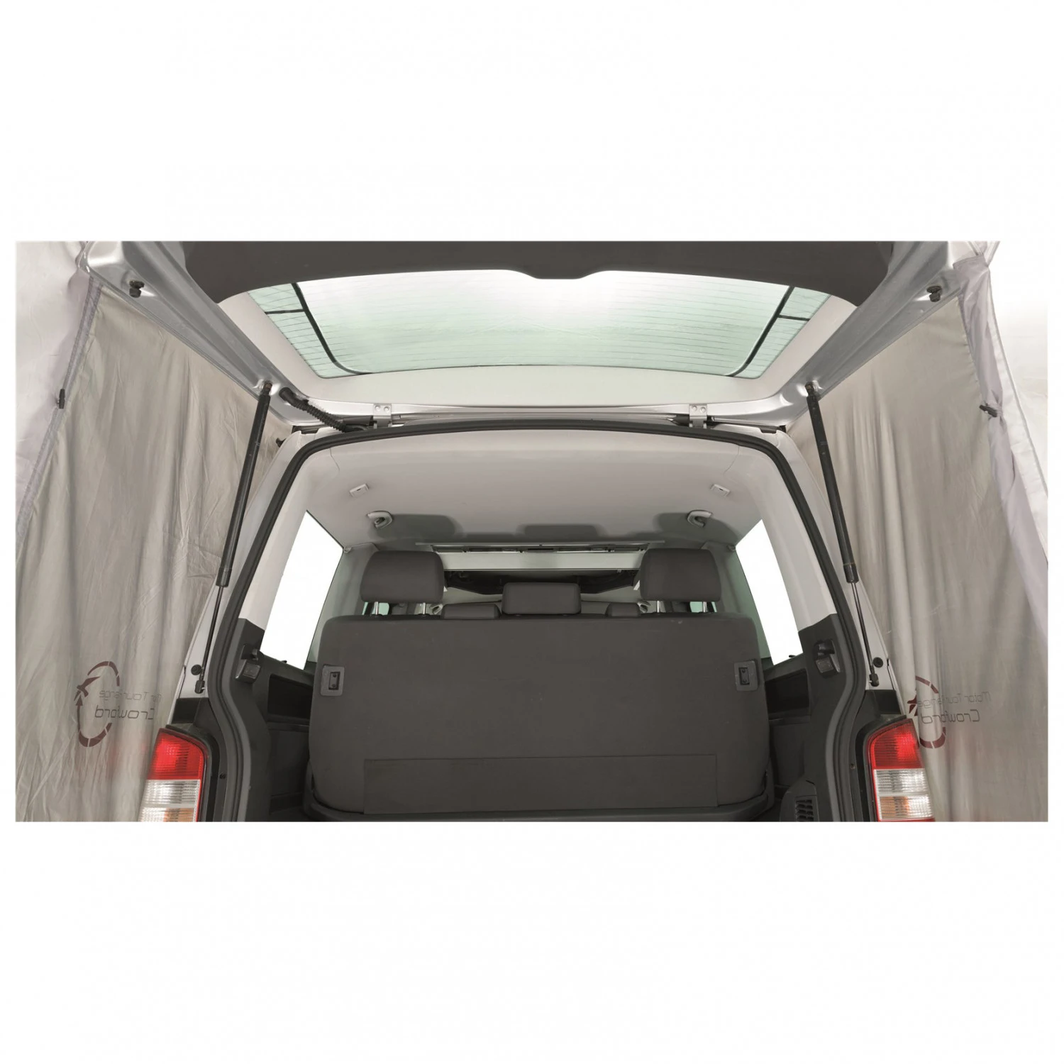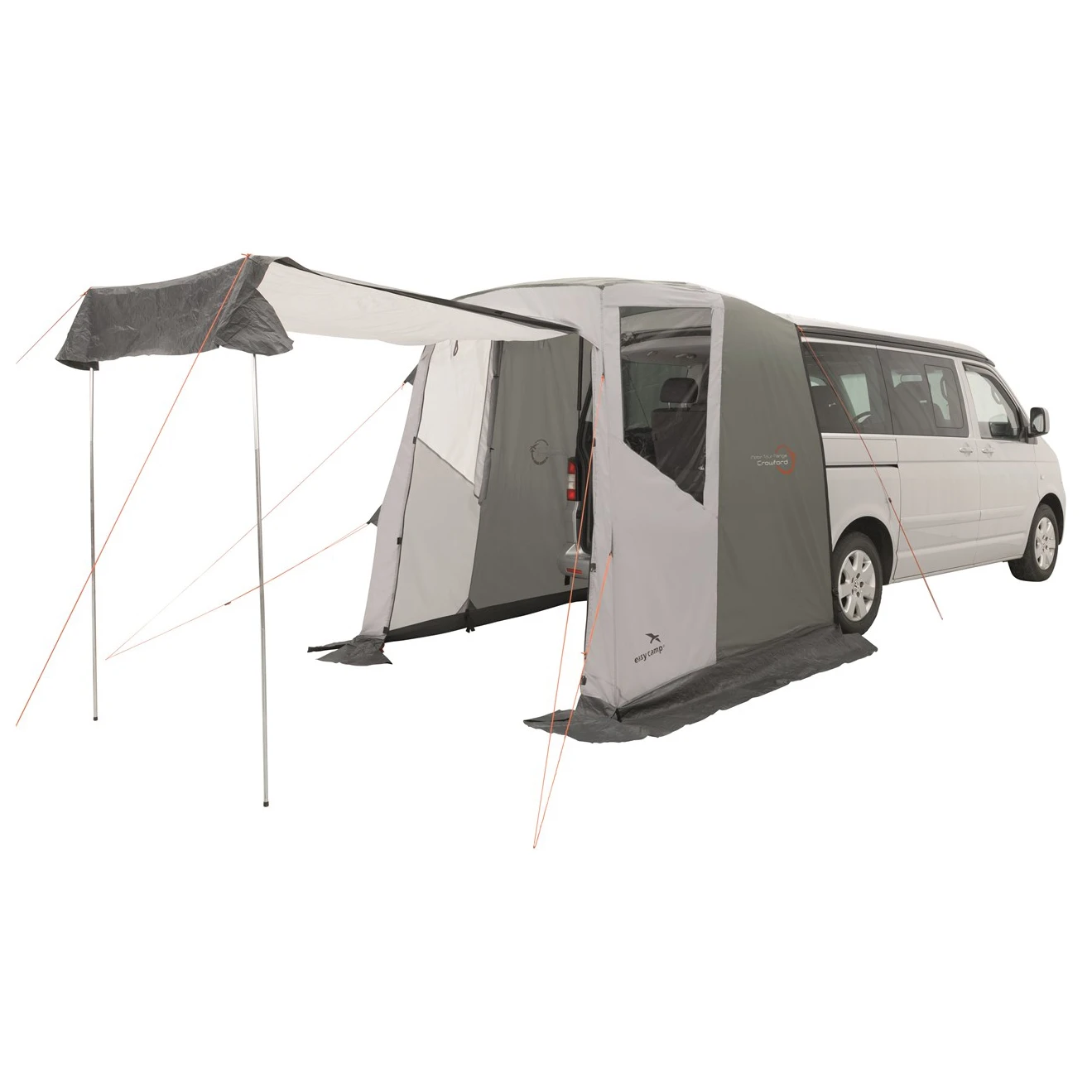 Das Crowford von Easy Camp wurde speziell für die Anbringung an der Heckklappe der Modelle T5 und T6 California von VW entworfen. Es schafft zusätzlichen Wohnraum und ist daher besonders für mehrtägige Aufenthalte auf dem Campingplatz geeignet. Die seitlichen Fenster und der großzügige Eingang sorgen für viel Licht im Innenraum, können bei Bedarf aber auch mit den aufrollbaren Vorhängen verschlossen werden. Der Eingang kann mit zwei Stangen auch aufgestellt werden und schafft einen weiteren Platz, der vor Sonne und Regen geschützt ist.