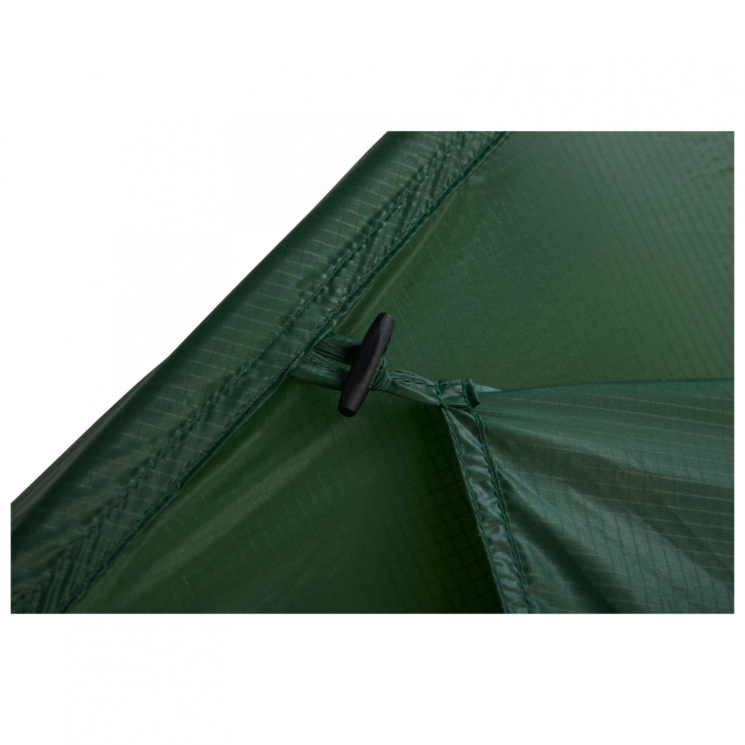 Robust und leicht, das Exogen 2 Zelt für zwei Personen von Wechsel. Das gesamte Zelt besteht aus Ripstop Nylon. Das Außenzelt ist durch die beidseitige Behandlung der Oberfläche mit Silikon besonders reißfest, strapazierfähig und stark UV-Resistent. Die Nähte des Bodens wurden zusätzlich getaped. So wird die wasserabweisende Wirkung nochmals erhöht und er kommt auf eine Wassersäule von 5000 mm. Hierdurch muss man sich auch bei Starkregen keine Gedanken über durchdrückende Feuchtigkeit machen. Das Innenzelt hat ebenfalls eine wasserabweisende Wirkung, ist aber atmungsaktiv und sorgt für eine angenehme Belüftung. Um ein verwinden des Zeltes bei starkem Wind so gering wie möglich zu halten, werden die leichten Aluminiumstangen an zwei Knotenpunkten fixiert. Das Geodätzelt steht somit auch bei Wind sicher und das unangenehme Geflatter der Plane wird auf ein Minimum reduziert.